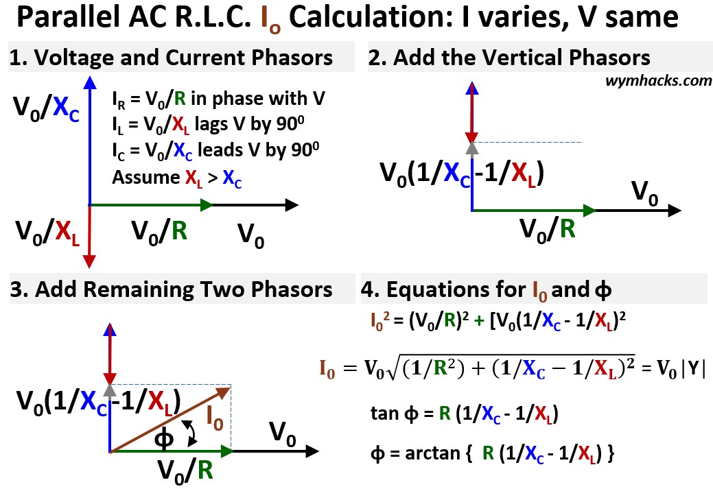 I0 = V0 sqrt { (1/R)2 + (1/XC -1/XL)2 } ; Parallel AC RLC