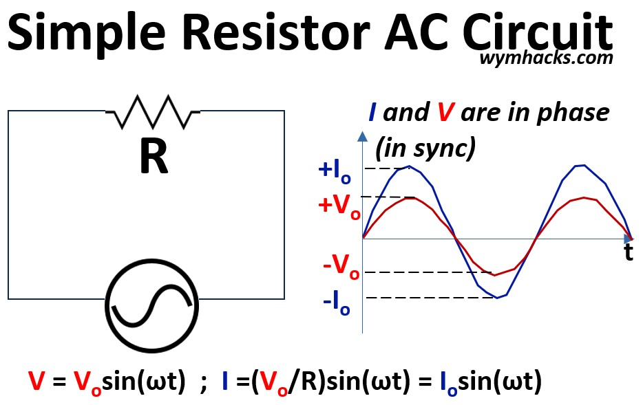 (2) I =(V0/R)sin(ωt) = I0sin(ωt) ; Current Equation Pure Resistive AC Circuit