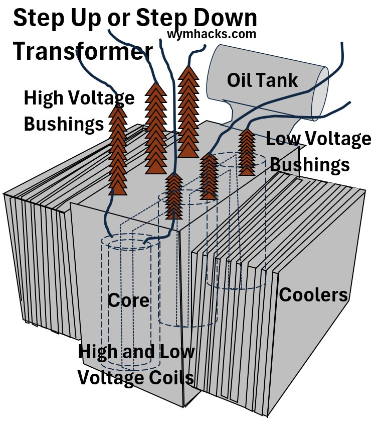 • Step-up Transformers that boost the voltage to hundreds of thousands of volts for efficient long-distance travel.