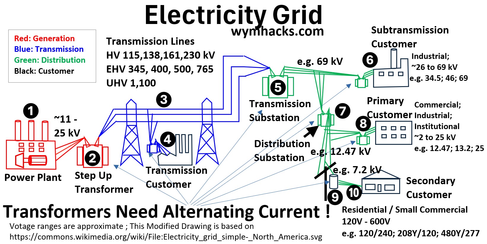 The generating stations (#1 in the drawing above) in these facilities create high-voltage alternating current (AC) power, often at ~ 11 kV to 25 kV (kV is thousands of Volts) .