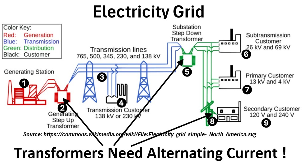 This efficient, wave-like delivery of power is what allows electricity to be transmitted over long distances to reach our homes and businesses. (see the section “But Why AC” for more on this).