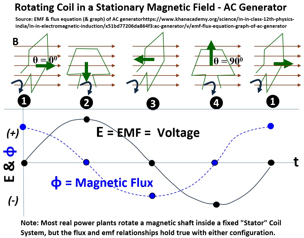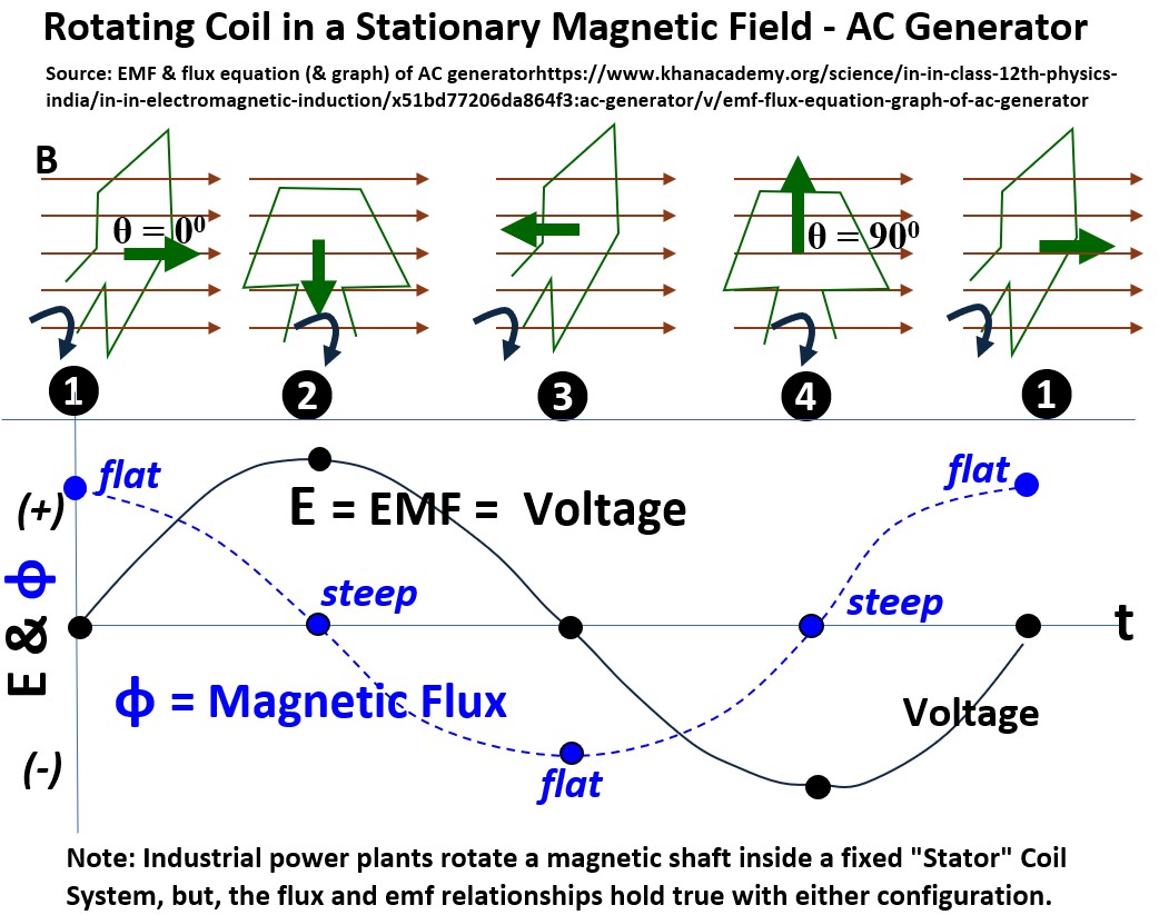 • A plot of Magnetic flux Φ and EMF (E or Voltage) vs time is generated with each 90 degree rotation of the coil.