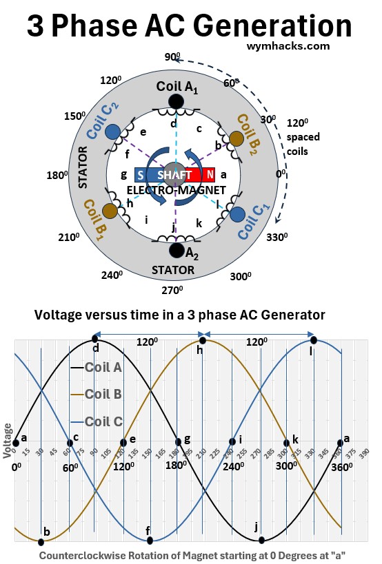 We’ll also explain why three phase AC is better than single phase AC and why we need AC in the first place versus DC for example (hint: it’s the grid stupid).