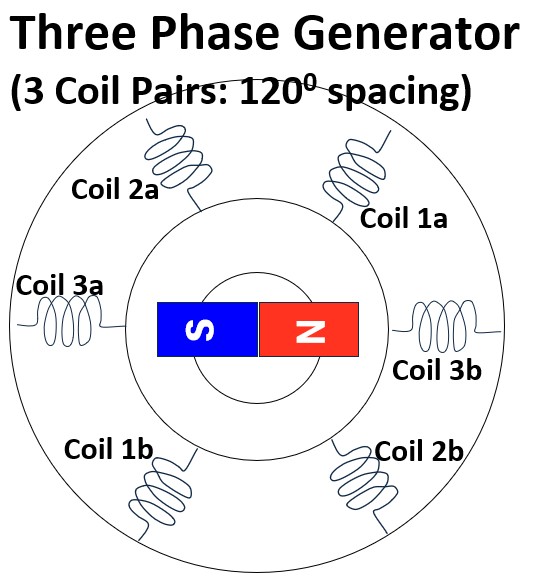 This article explains the generation of three-phase (i.e. three separate voltages being produced) AC power, starting with the basic physics of a single-phase model.
