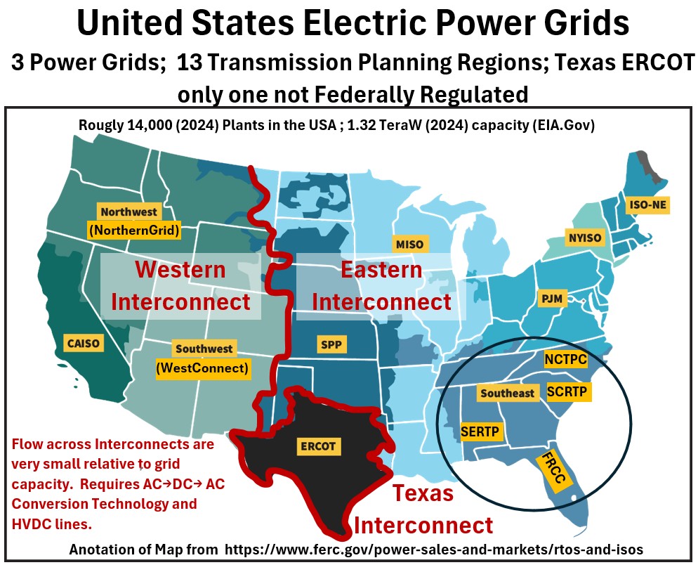 Because these systems operate on alternating current (AC) and must be perfectly synchronized at 60 Hz, they are mostly separated to prevent a failure in one region from collapsing the others.