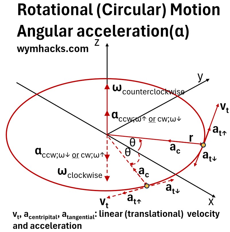 - the angular acceleration vector α points along the z-axis (up or down) based on two factors: the direction of rotation and whether the rotation is speeding up or slowing down.