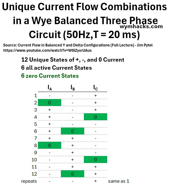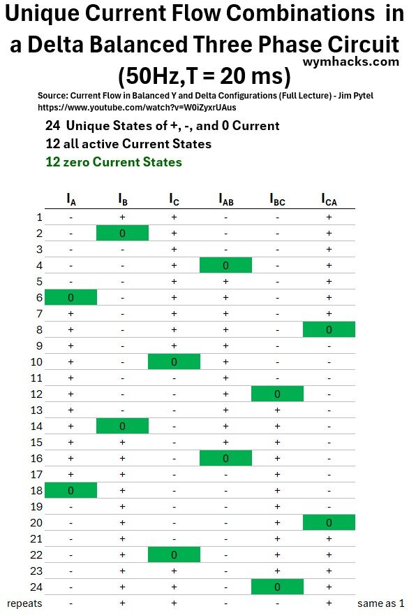 Table: Unique Current Flow Combinations in a Delta Balanced Three Phase Circuit